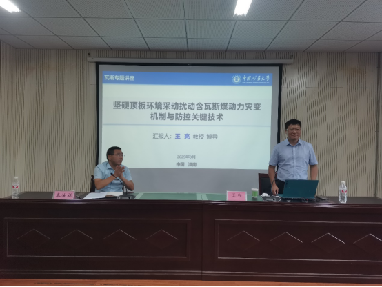 王亮教授针对高瓦斯易自燃煤层覆岩含厚硬岩层场景下“多灾害交织”的复杂难题,介绍了团队在坚硬顶板和煤层群复杂开采地层环境下,关于开采扰动导致瓦斯、煤自燃、冲击地压、突水等多灾害发生机制的研究成果,以及对应的防控关键技术方法,深入剖析了厚硬岩层见方失稳破断冲击力能引发突水和冲击地压事故的内在机制。学院师生对“坚硬顶板条件下多灾害协同防控技术”等关键方向表达了浓厚兴趣,与王教授展开了深入的学术探讨。王教授强调,针对复杂开采地层环境精准剖析灾害发生机制,是优化多灾害防控方案、提升矿井安全生产保障能力的核心。